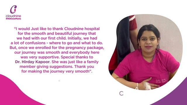 "I would Just like to thank Cloudnine hospital for the smooth and beautiful journey that we had with our first child. Initially, we had a lot of confusions - where to go and what to do. But, once we enrolled for the pregnancy package, our journey was smooth and everybody here was very supportive. Special thanks to Dr. Hirday Kapoor. She was just like a family member giving suggestions. Thank you for making the journey very smooth"