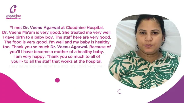 "I met Dr. Veenu Agarwal at Cloudine Hospital. Dr. Veenu Ma'am is very good. She treated me very well. I gave birth to a baby boy. The staff here are very good. The food is very good. I'm well and my baby is healthy too. Thank you so much Dr. Veenu Agarwal. Because of YoU'll I have become a mother of a healthy baby. I am very happy. Thank you so much to all of you'll- to all the staff that works at the hospital. They have looked after me and my child very well Thank you so much"